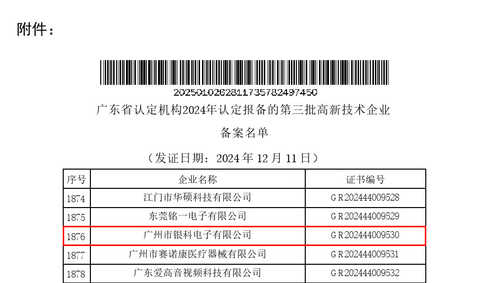 日前,根据《高新技术企业认定管理办法》(国科发火〔2016〕32号)和《高新技术企业认定管理工作指引》(国科发火〔2016〕195号)有关规定,高新技术企业认定管理工作网站公告了2024年认定报备的第三批高新技术企业名单,广州市银科电子有限公司再次成功通过国家高新技术企业认定。